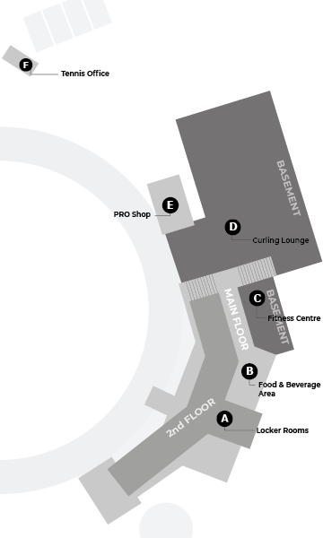 A) Men's & Women's Locker Rooms; B) Food & Beverage Area; C) Fitness Office; D) Curling Lounge; E) Pro Shop; F) Tennis Court Office